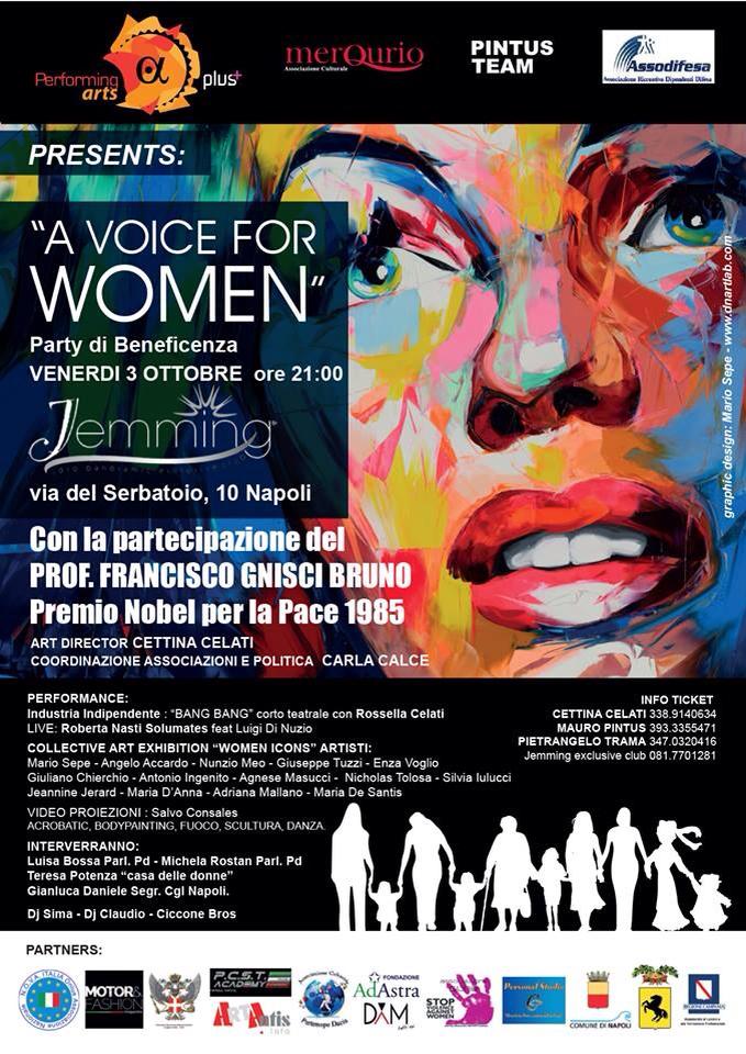 Venerdì 3 ottobre alle ore 21.00 arriva a Napoli, città femmina per eccellenza,“A Voice for Women”un evento per dar voce a chi ancora troppo spesso non ne ha ed al contempo per gridare forte il proprio sdegno verso la violenza contro le donne e, più in generale, verso la differenza di genere.Perché AGIRE si può e si deve.