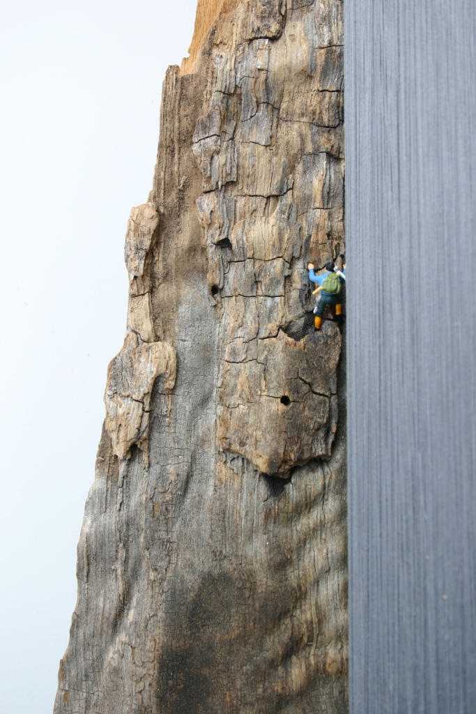 Cortecce d’albero e cippi di legno assumono l’aspetto di altopiani su cui si intravedono delle minuscole figure; gli elementi miniaturistici appaiono come degli elementi di disturbo, componenti intrusive all’interno di ecosistemi che proprio per questo rischiano di perdere la loro “virginale” identità floreale e faunistica. La tranquillità di scenari montuosi viene quindi interrotta dagli usi e dagli abusi degli scalatori, i quali inseguono i loro sogni di gloria e cercano di combattere le proprie paure di fronte a Madre Natura.