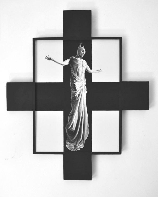 Utilizzando strategicamente un materiale innovativo (il vetroresina, più esattamente) per inarcare lo sguardo sulla mimesis e cavalcare la mitologia attuale da cui recuperare la figura epica del supereroe (This is not a love song (2023), in mostra, è un Batman che sembra uscire da una parete (da uno schermo liquido) per solidificarsi, Adrian Tranquilli (Melbourne, 1966) crea sin dalla Profezia del 1998 nuovi racconti capaci di intersecare la storia dell’arte – dal recupero della statuaria classica greco-romana alla perfezione rinascimentale, dalla spettacolarità barocca (centrale è Bernini) alla forza evolutiva toccata dal neoclassicismo di Canova, Acquisti, Morelli – a quella delle idee e dunque dei vari tessuti culturali dell’umanità.