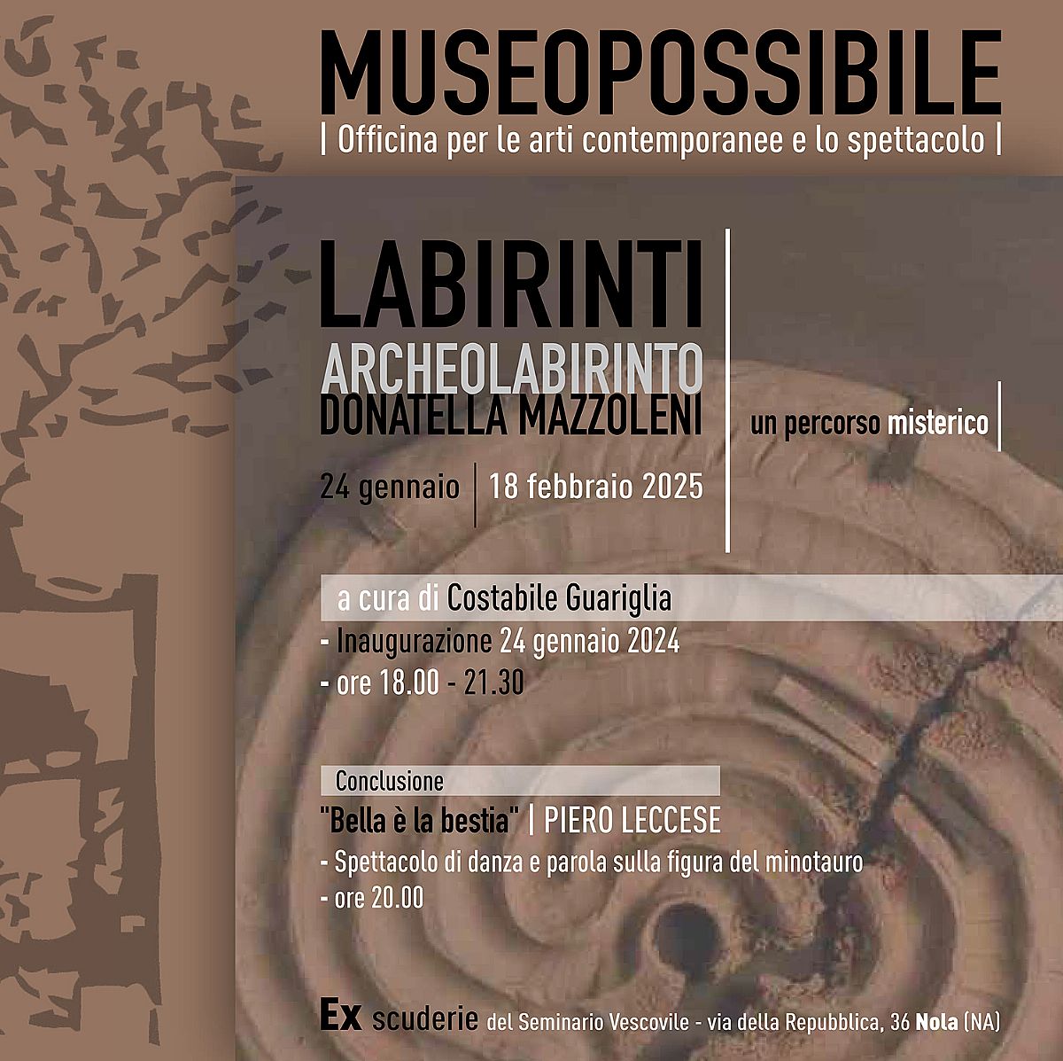 Venerdi 24 gennaio alle ore 18.00 sarà presentata presso la galleria Museopossibile la mostra “Labirinti” dell’artista e architetto Donatella Mazzoleni a cura di Costabile Guariglia, nuovo appuntamento della stagione di programmazione 2024-2025.