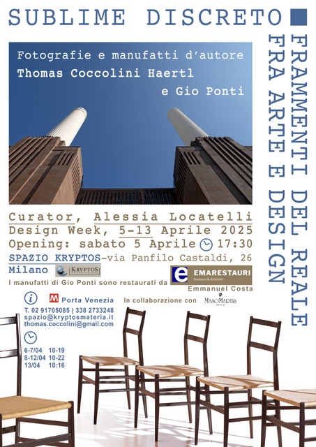 In occasione della Design Week milanese, l’evento OFF del Salone del Mobile, Lo Spazio Kryptos apre il 5 Aprile con la mostra fotografica personale di Thomas Coccolini Haertl, architetto e fotografo. Un progetto che si lega al grande design italiano, fra arte della rappresentazione e oggetti d’arredo firmati Gio Ponti, qui ritrovati grazie alla ricerca e al restauro di Emmanuel Costa che da Chiavari, suo luogo natìo, riporta in vita la tradizione delle rinomate Sedie Chiavarine. Un incontro che celebra arte visiva e design. Una sinergia tra lo sguardo esterno della fotografia, capace di condurci in luoghi oltre il tempo e le dimensioni fisiche dello spazio; e l’arredo Iconico dell’Italian Style, che riporta verso uno sguardo interno e domestico, inserito nel quotidiano e strettamente correlato alla forma e all’uso.